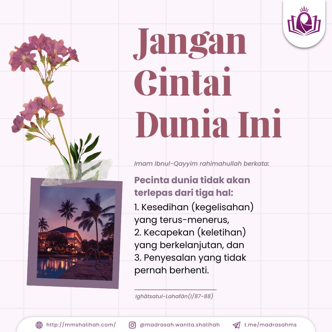 Imam Ibnul-Qayyim rahimahullah berkata: Pecinta dunia tidak akan terlepas dari tiga hal: 1. kesedihan (kegelisahan) yang terus-menerus, 2. kecapekan
