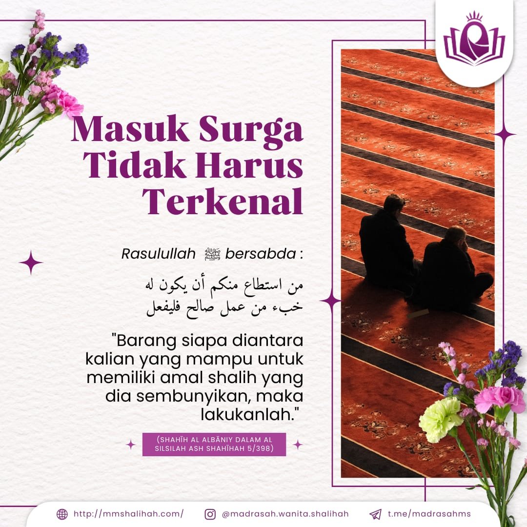 Rasulullah ﷺ bersabda : ﻣﻦ ﺍﺳﺘﻄﺎﻉ ﻣﻨﻜﻢ ﺃﻥ ﻳﻜﻮﻥ ﻟﻪ ﺧﺐﺀ ﻣﻦ ﻋﻤﻞ ﺻﺎﻟﺢ ﻓﻠﻴﻔﻌﻞ “Barang siapa diantara kalian yang mampu