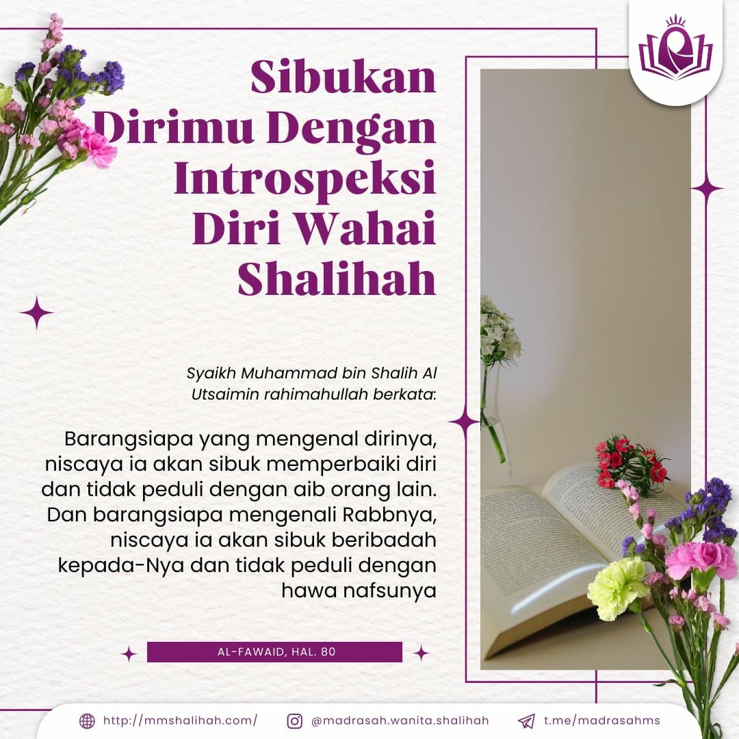 Orang yang menyibukkan hatinya untuk menghitung segala aibnya, dosa-dosanya maka tak akan lisannya menikam saudaranya dengan ghibah. Hatinya tak akan memandang