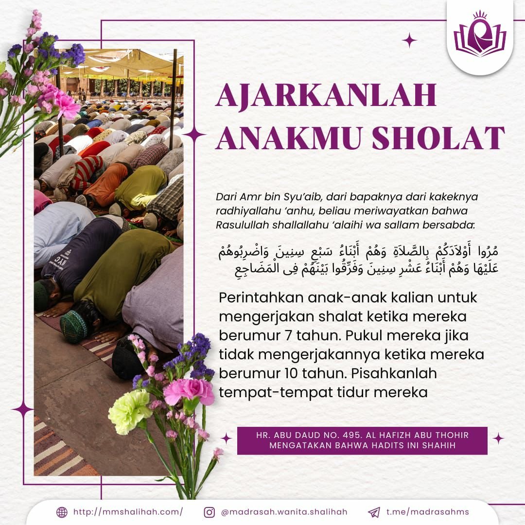 Dari Amr bin Syu’aib, dari bapaknya dari kakeknya radhiyallahu ‘anhu, beliau meriwayatkan bahwa Rasulullah shallallahu ‘alaihi wa sallam bersabda, مُرُوا أَوْلاَدَكُمْ