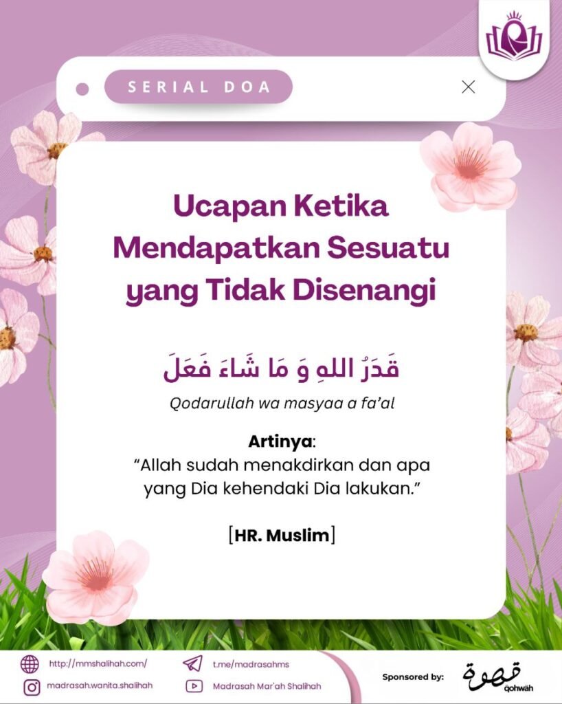 Ketika kenyataan tak sesuai harapan, ketika impian tak sesuai dengan kenyaataan. Maka, ucapkanlah: قَدَرُ اللهِ وَ مَا شَاءَ فَعَلَ Qodarullah wa