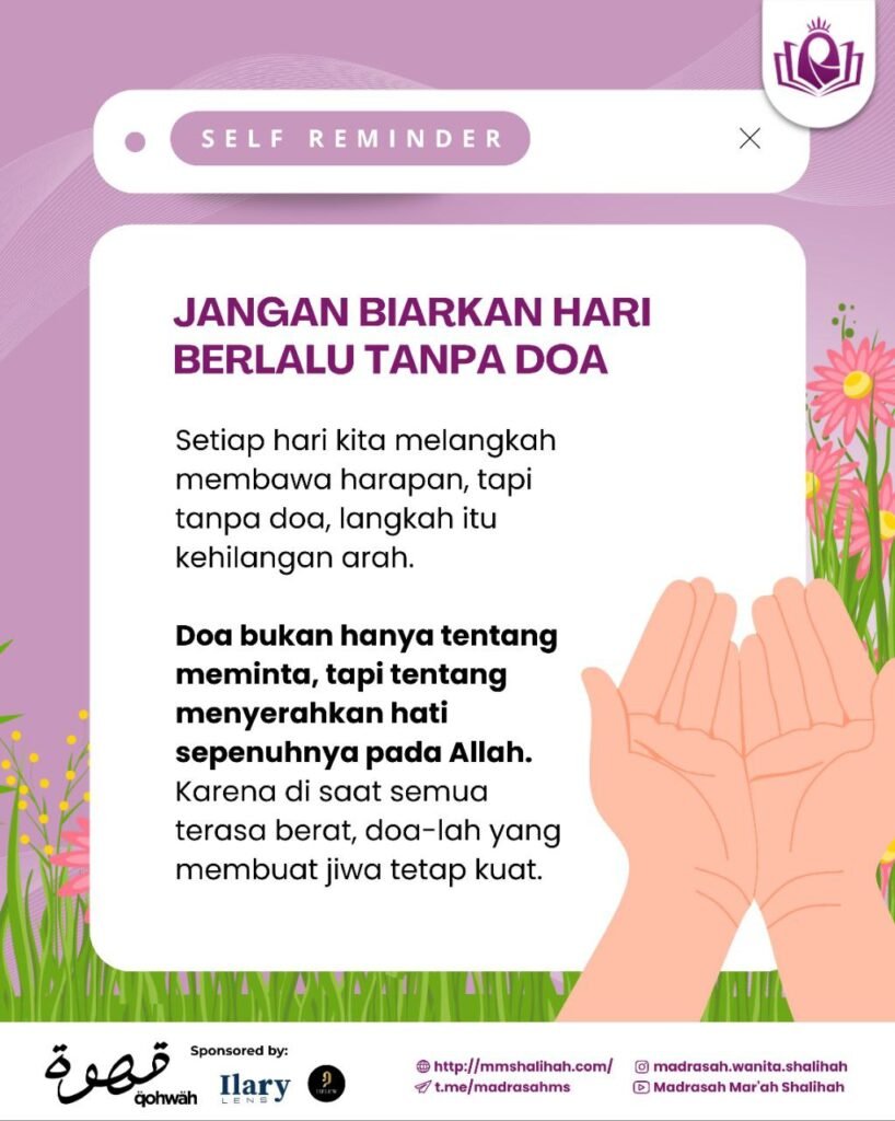 Jangan biarkan harimu berlalu tanpa doa. Sebab doa bukan hanya tentang meminta, tapi tentang mengingat siapa yang menggenggam hidupmu sepenuhnya. Di