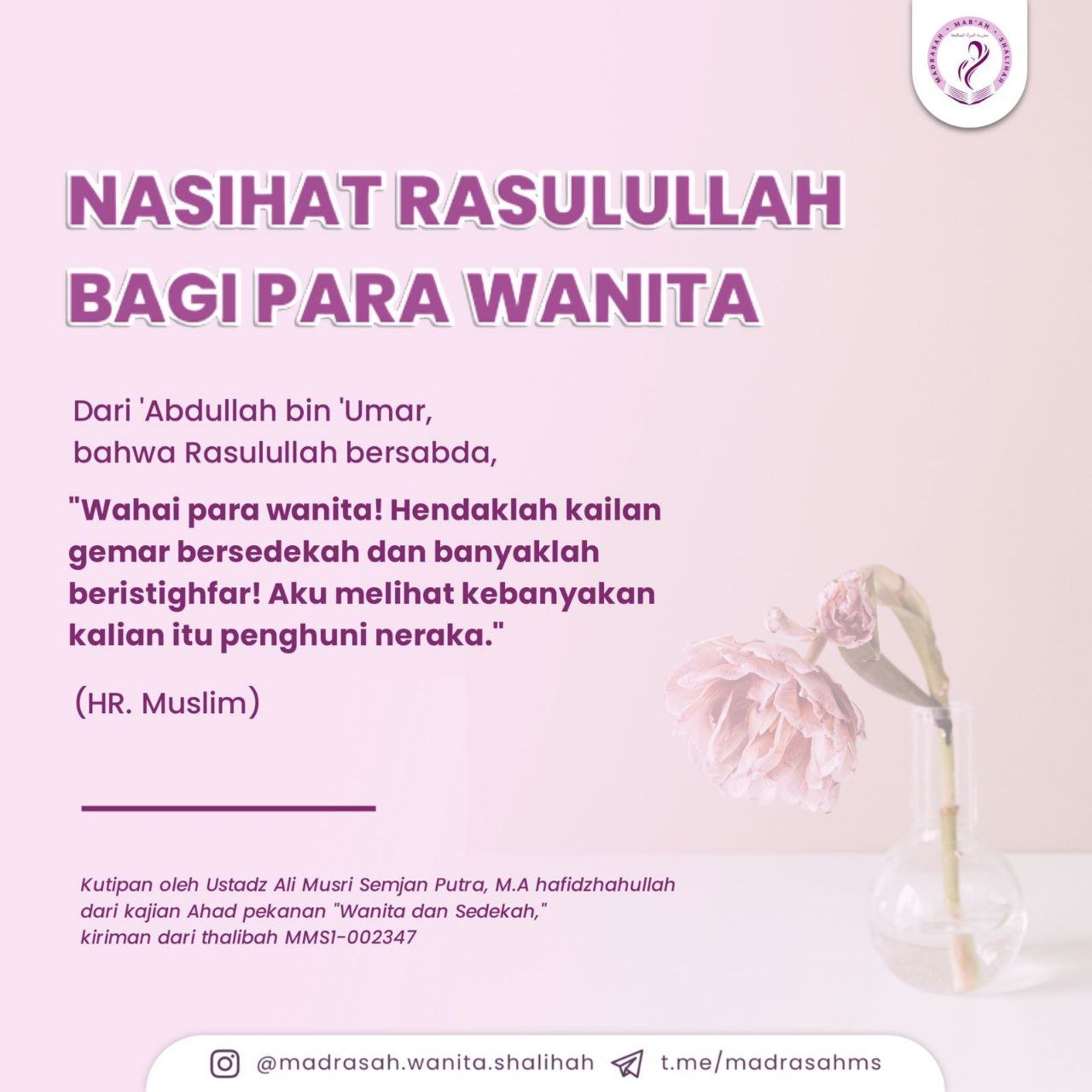 Dari ‘Abdullah bin ‘Umar, bahwa Rasulullah bersabda, “Wahai para wanita! Hendaklah kailan gemar bersedekah dan banyaklah beristighfar! Aku melihat kebanyakan kalian