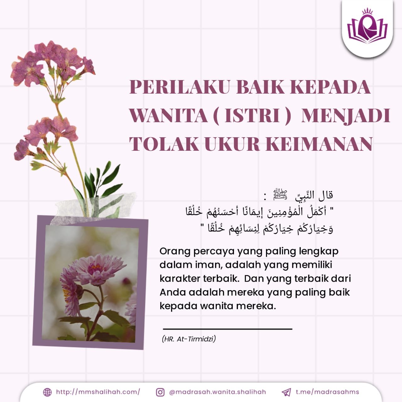 قال النَّبِيِّ ﷺ : ” أَكْمَلُ الْمُؤْمِنِينَ إِيمَانًا أَحْسَنُهُمْ خُلُقًا وَخِيَارُكُمْ خِيَارُكُمْ لِنِسَائِهِمْ خُلُقًا ” “Orang percaya (mukmin) yang