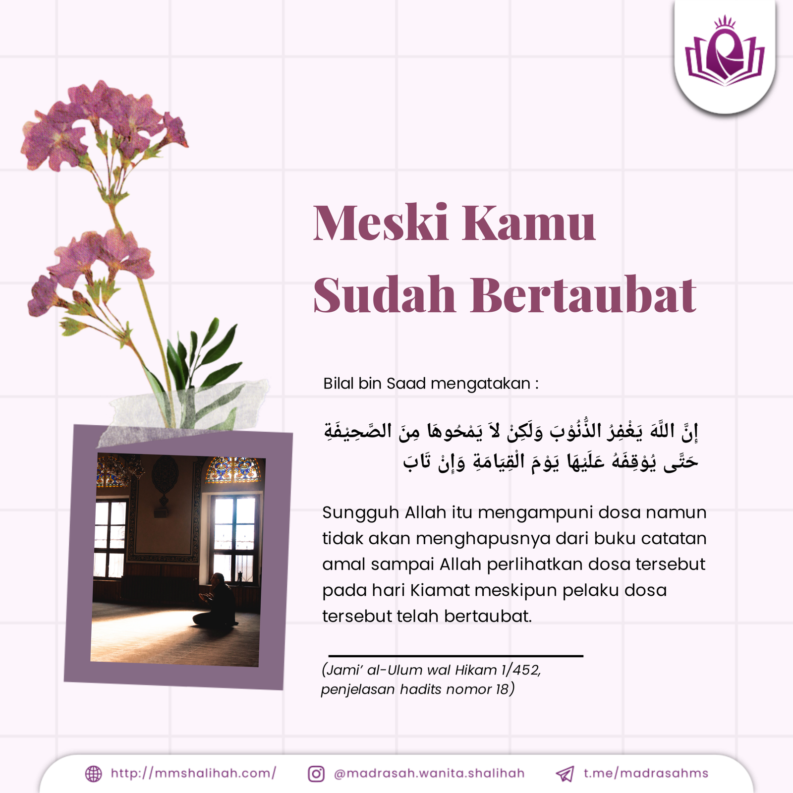 Bilal bin Saad mengatakan: إِنَّ اللَّهَ يَغْفِرُ الذُّنُوْبَ وَلَكِنْ لاَ يَمْحُوهَا مِنَ الصَّحِيْفَةِ حَتَّى يُوْقِفَهُ عَلَيْهَا يَوْمَ الْقِيَامَةِ