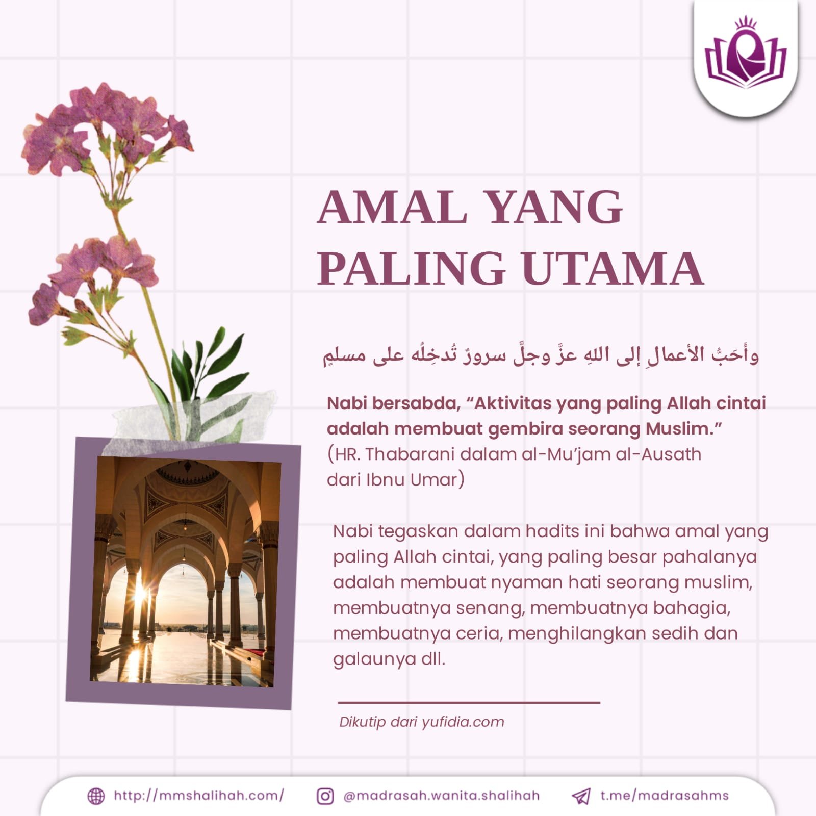 Nabi Muhammad Shallallāhu alaihi wasallam bersabda, وأَحَبُّ الأعمالِ إلى اللهِ عزَّ وجلَّ سرورٌ تُدخِلُه على مسلمٍ “Aktivitas