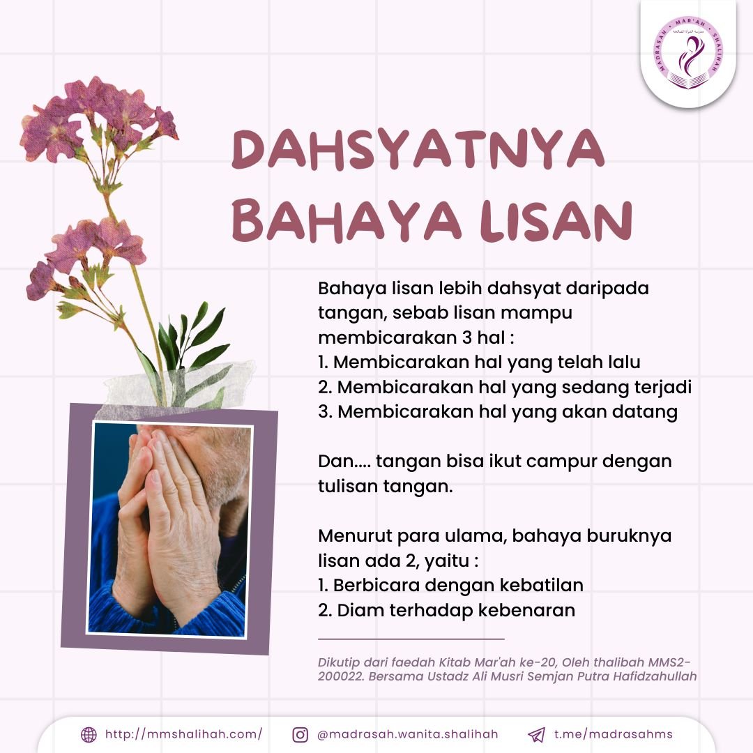 Bahaya lisan lebih dahsyat daripada tangan, sebab lisan mampu membicarakan 3 hal : Membicarakan hal yang telah lalu Membicarakan hal yang