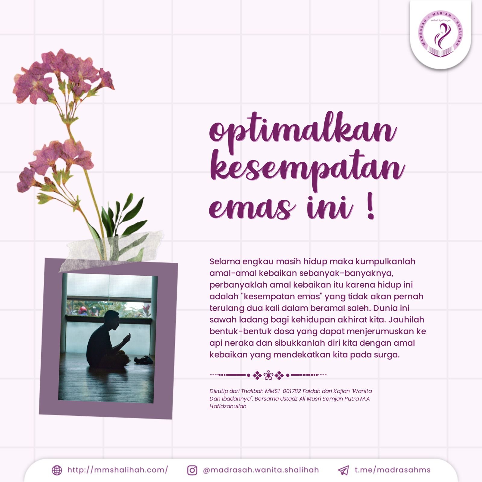 Selama engkau masih hidup maka kumpulkanlah amal-amal kebaikan sebanyak-banyaknya, perbanyaklah amal kebaikan itu karena hidup ini adalah “kesempatan emas”