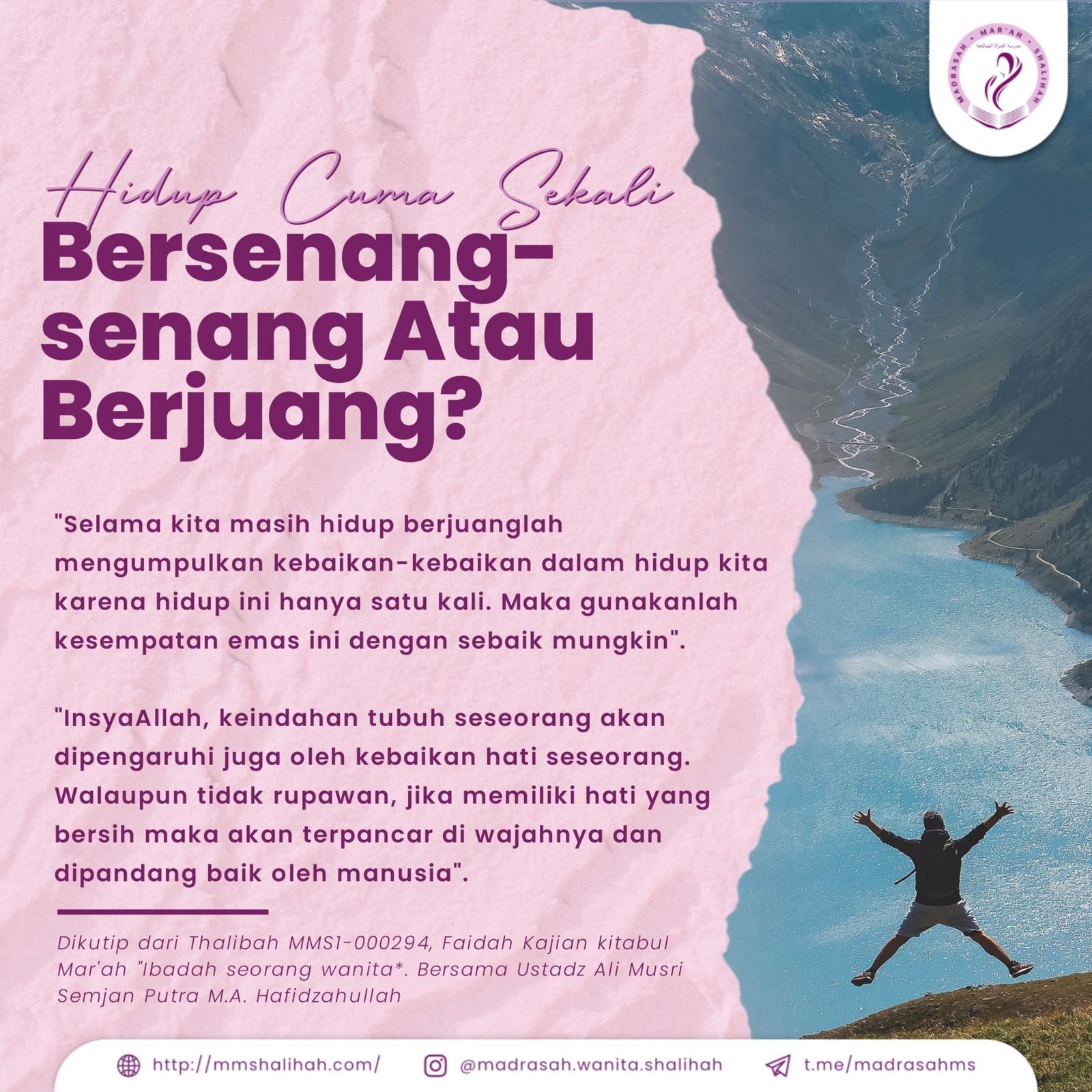 Selama kita masih hidup berjuanglah mengumpulkan kebaikan-kebaikan dalam hidup kita karena hidup ini hanya satu kali. Maka gunakanlah kesempatan