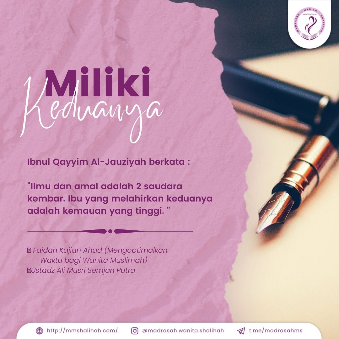 ibnul Qayyim Al-Jauziyah berkata : “Ilmu dan amal adalah 2 saudara kembar. Ibu yang melahirkan keduanya adalah kemauan yang