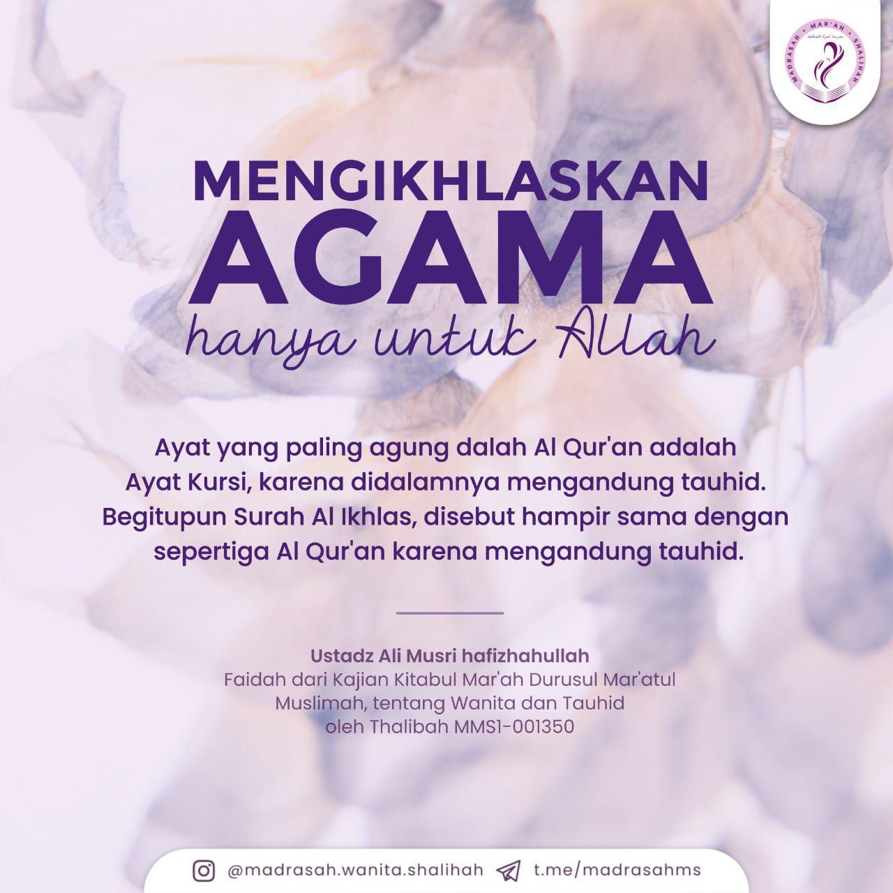 Ayat yang paling Agung dalam al Qur’an adalah Ayat Kursi karena didalamnya mengandung Tauhid. Begitupun Surah Al Ikhlas disebut