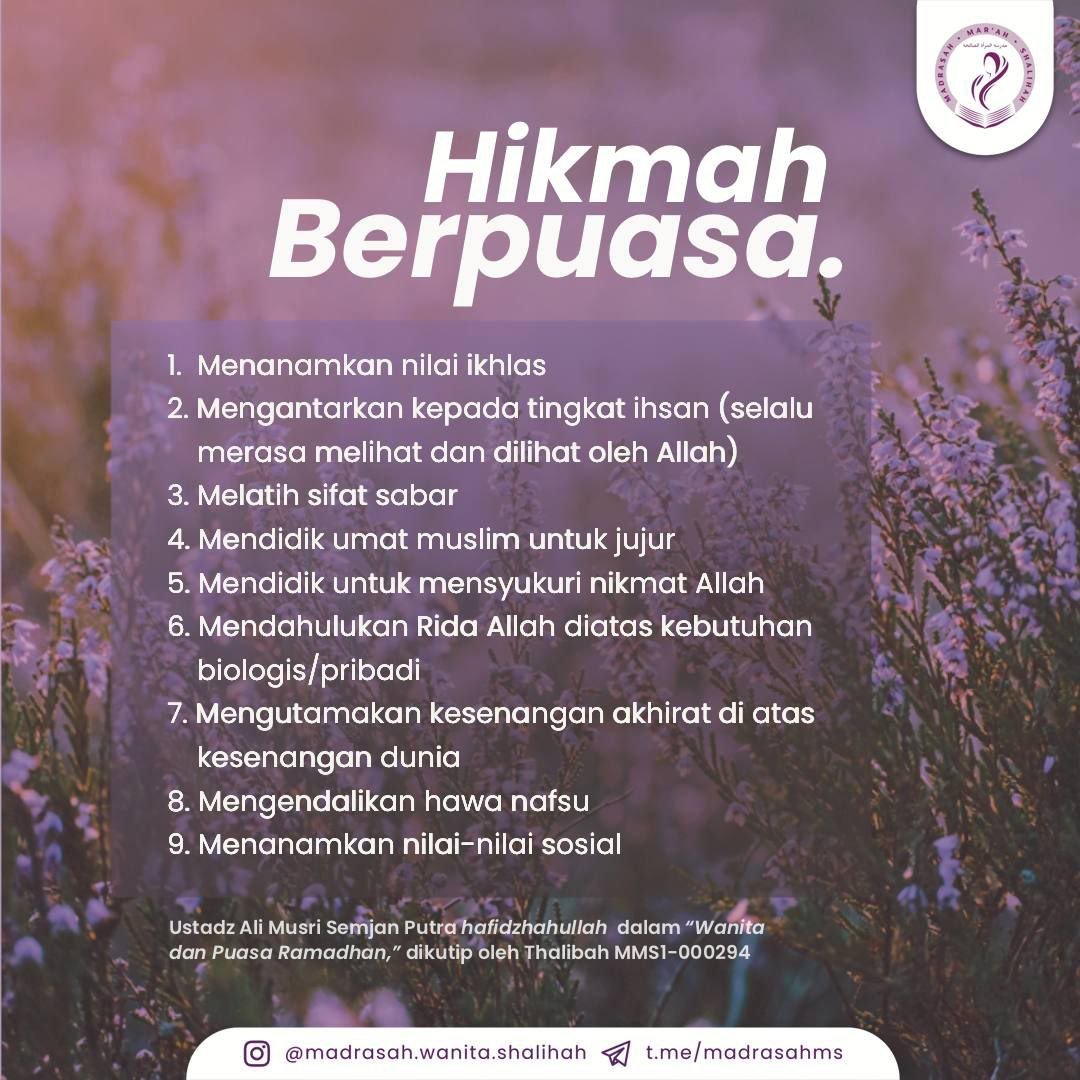 Diantara hikmah berpuasa antara lain : 1. Menanamkan nilai Ikhlas 2. Mengantarkan kepada
