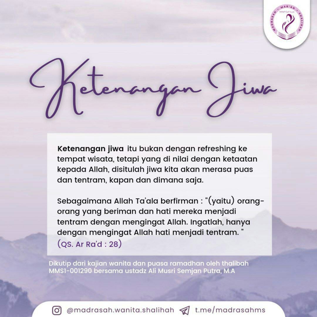 Ketenangan jiwa itu bukan dengan refresing ke tempat wisata tetapi yang di nilai dengan ketaatan kepada Allah, disitulah jiwa